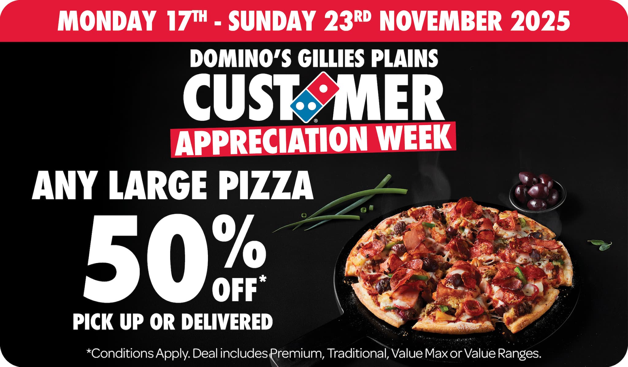 *10% surcharge applies on Sundays and after 10pm in selected stores. Surcharge of up to 20% applies on Public Holidays. Minimum delivery order $22.90 (excluding extended delivery, after 10pm, Sunday, and Public Holiday surcharges). Additional charges apply for extra toppings, half 'n' half & indulgent crusts. Limited area for delivery. For full terms and conditions click here.