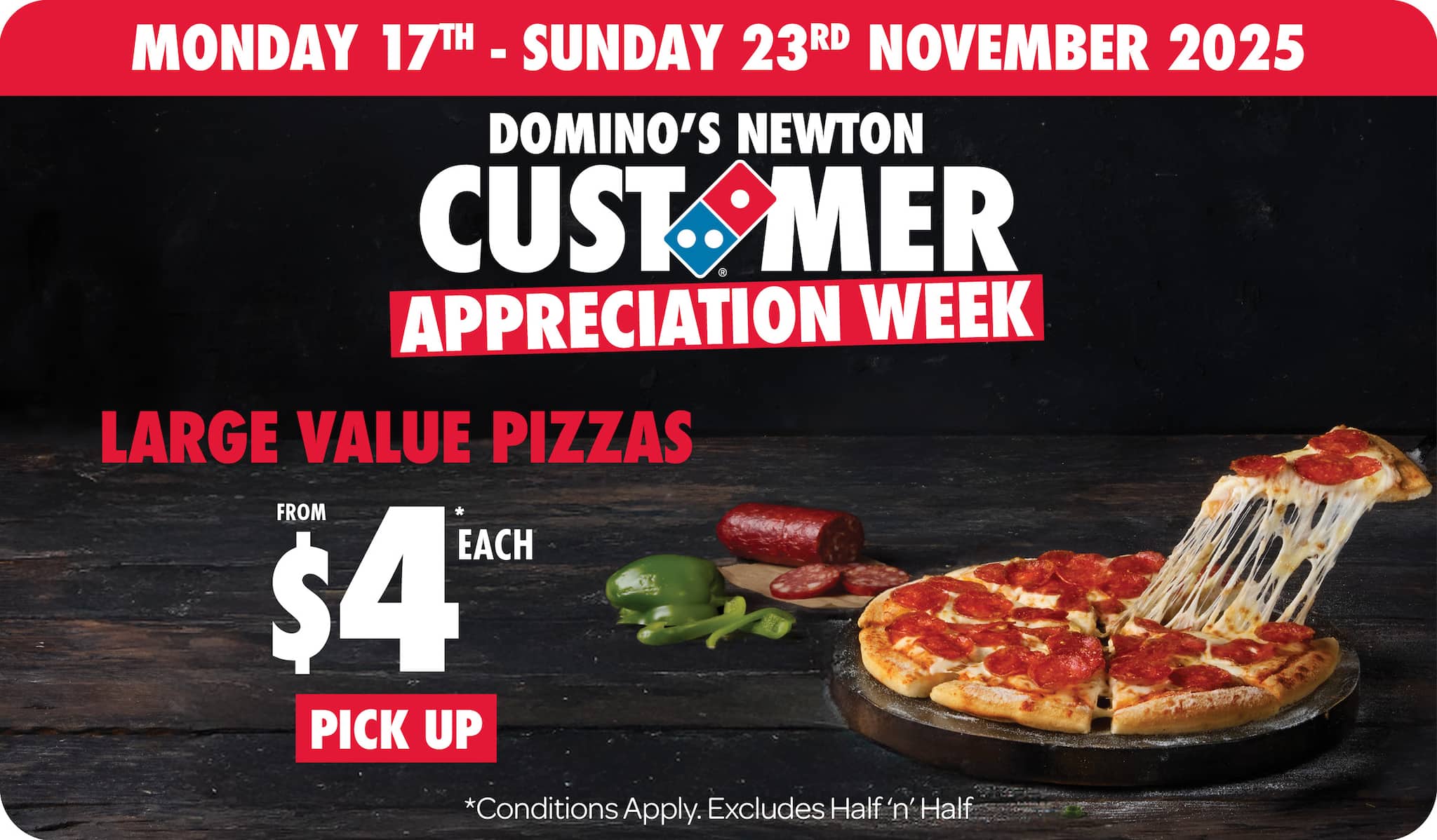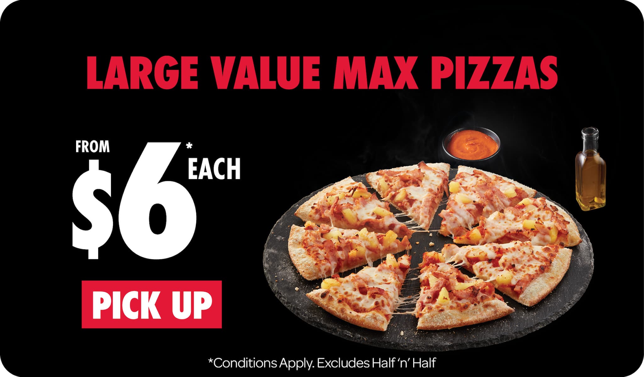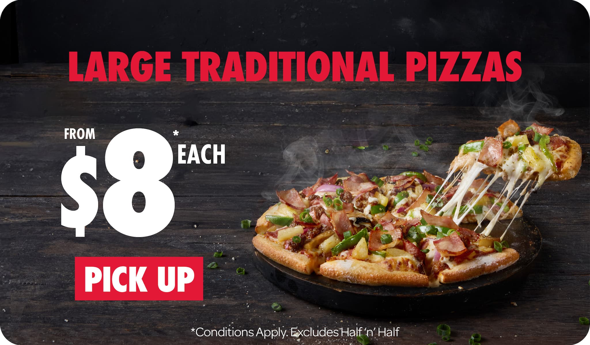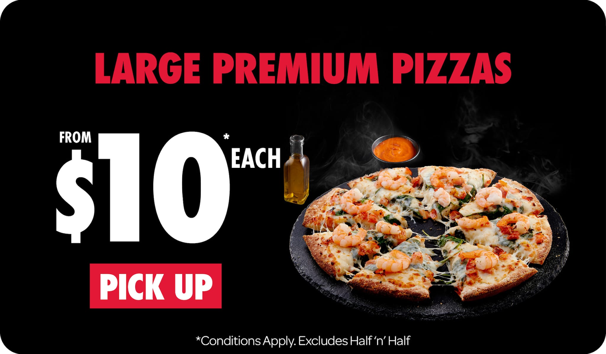 *10% surcharge applies on Sundays and after 10pm in selected stores. Surcharge of up to 20% applies on Public Holidays. Minimum delivery order $22.90 (excluding extended delivery, after 10pm, Sunday, and Public Holiday surcharges). Additional charges apply for extra toppings, half 'n' half & indulgent crusts. Limited area for delivery. For full terms and conditions click here.
