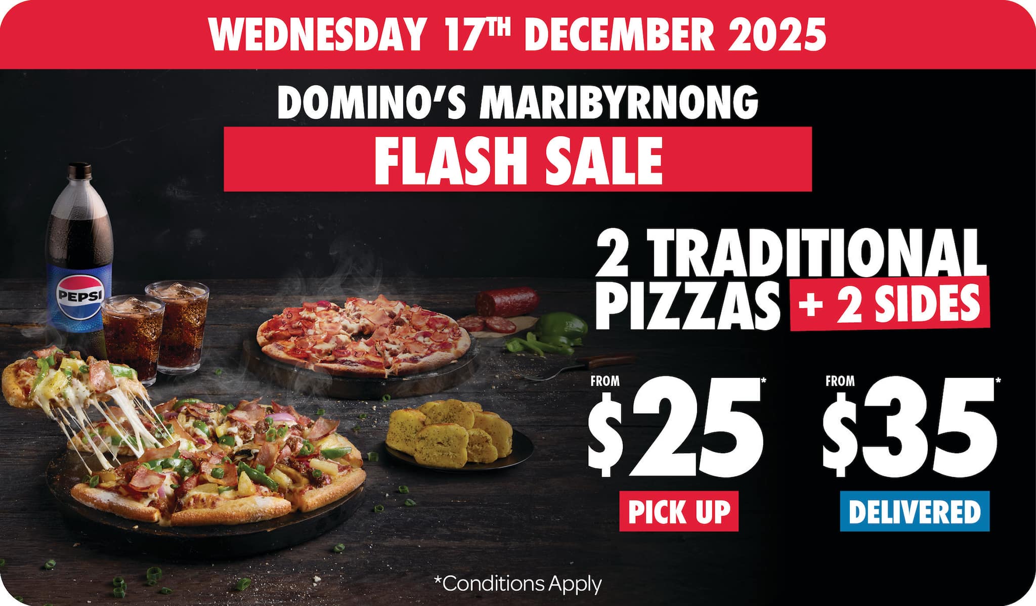 ORDER delivery NOW*Conditions apply. Valid on 17/12/2025 only. Deal includes Large Traditional Pizzas and Garlic Bread & 1.25L Drinks varieties.