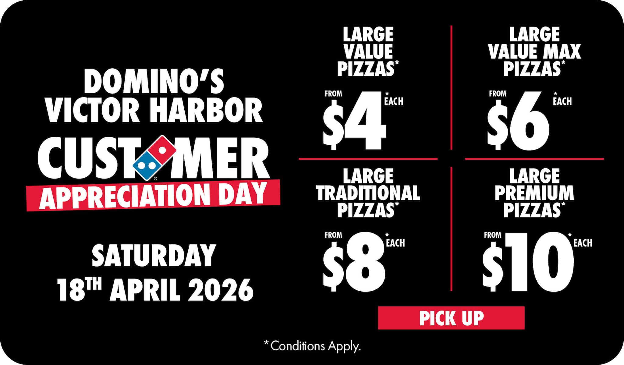 *10% surcharge applies on Sundays and after 10pm in selected stores. Surcharge of up to 20% applies on Public Holidays. Minimum delivery order $22.90 (excluding extended delivery, after 10pm, Sunday, and Public Holiday surcharges). Additional charges apply for extra toppings, half 'n' half & indulgent crusts. Limited area for delivery. For full terms and conditions click here.