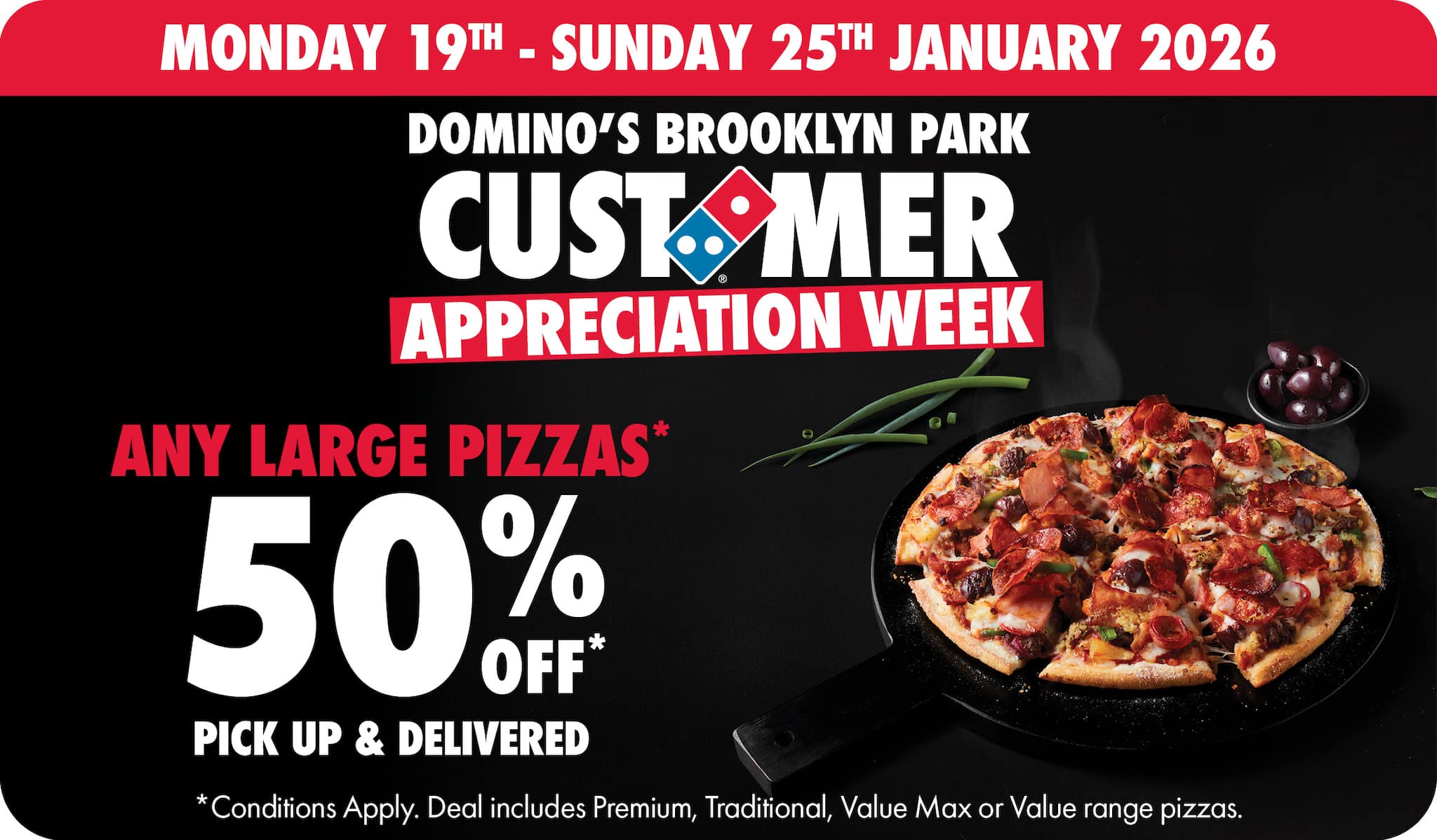 *10% surcharge applies on Sundays and after 10pm in selected stores. Surcharge of up to 20% applies on Public Holidays. Minimum delivery order $22.90 (excluding extended delivery, after 10pm, Sunday, and Public Holiday surcharges). Additional charges apply for extra toppings, half 'n' half & indulgent crusts. Limited area for delivery. For full terms and conditions click here.