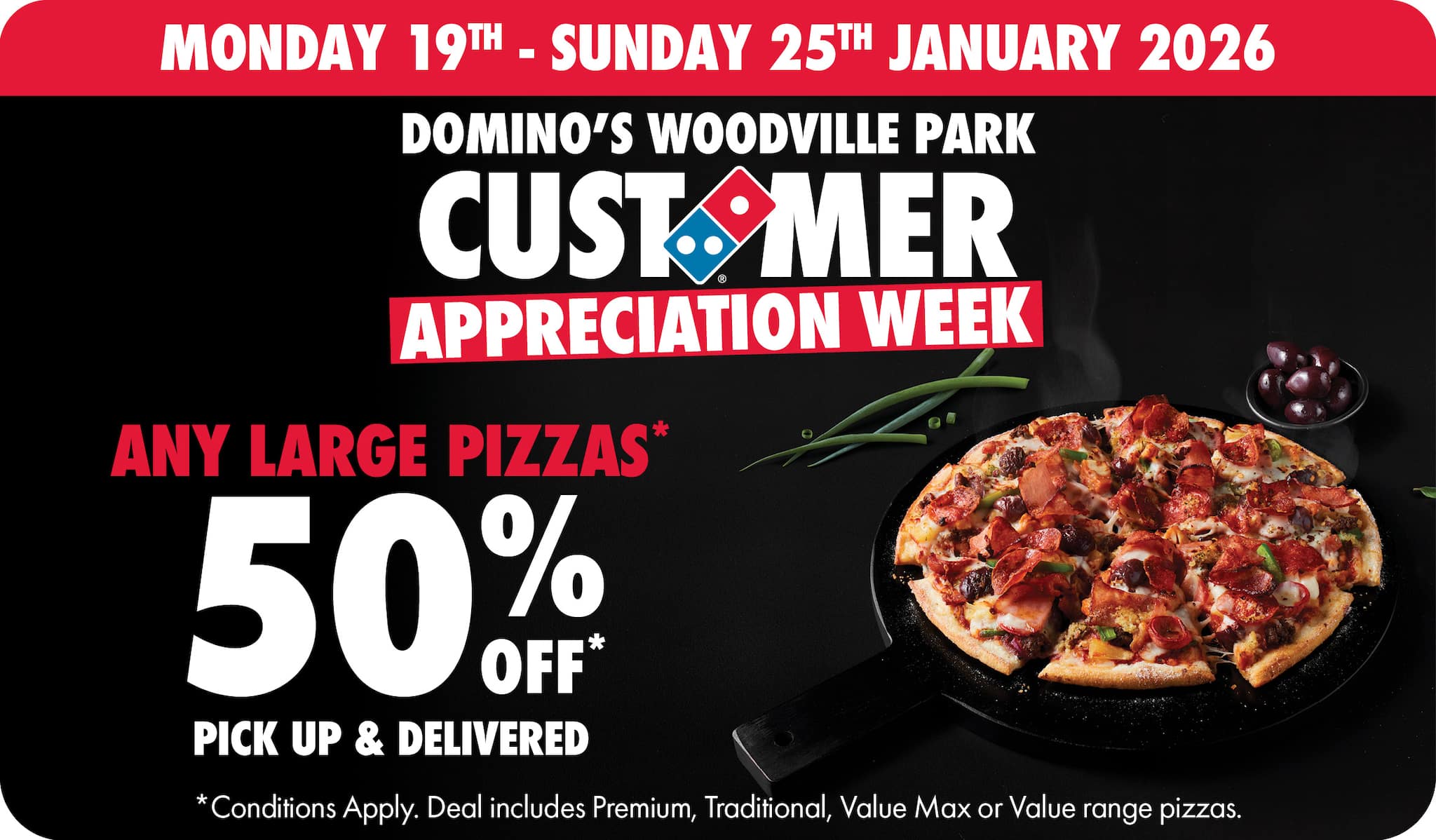 *10% surcharge applies on Sundays and after 10pm in selected stores. Surcharge of up to 20% applies on Public Holidays. Minimum delivery order $22.90 (excluding extended delivery, after 10pm, Sunday, and Public Holiday surcharges). Additional charges apply for extra toppings, half 'n' half & indulgent crusts. Limited area for delivery. For full terms and conditions click here.