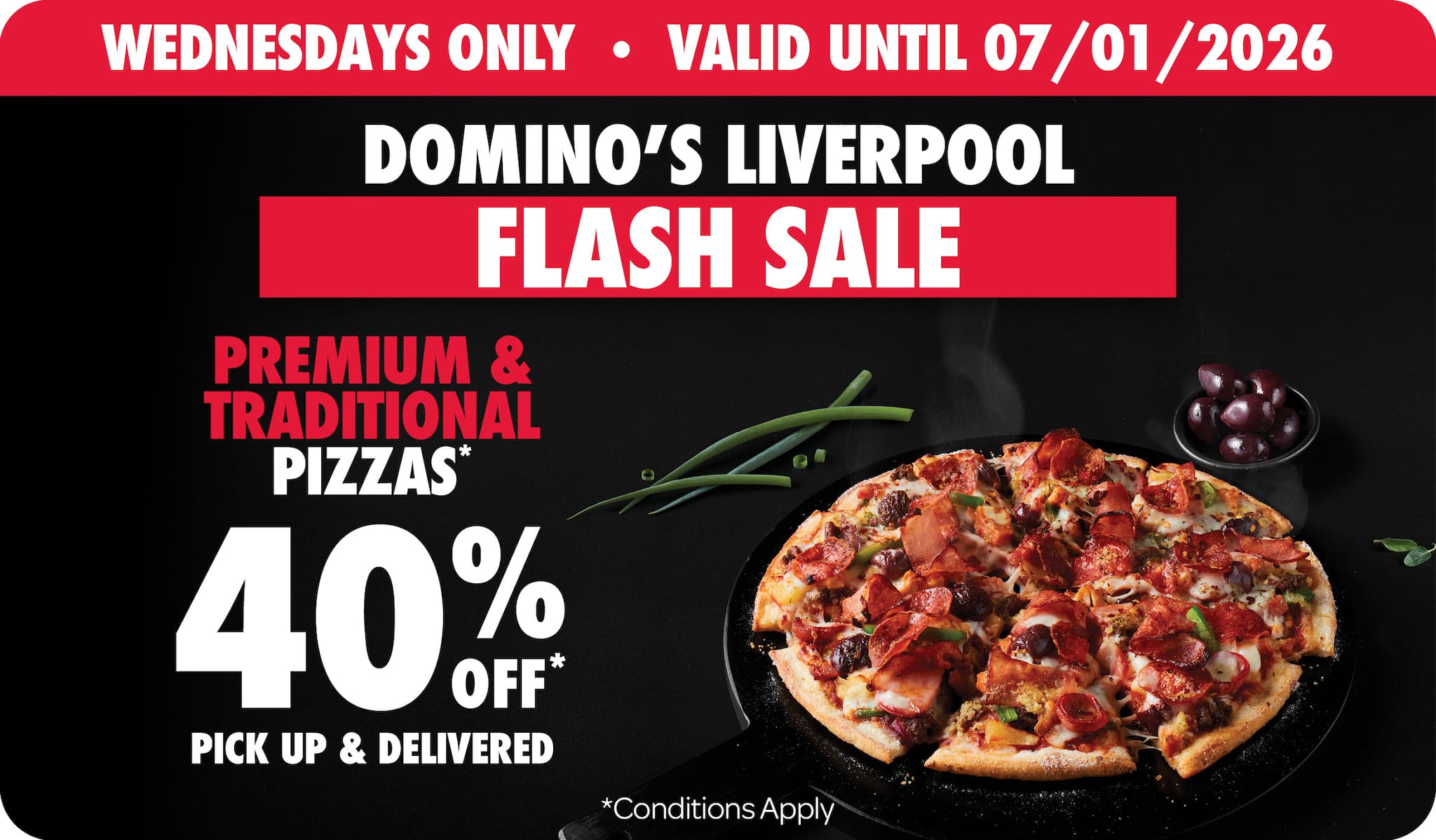 *10% surcharge applies on Sundays and after 10pm in selected stores. Surcharge of up to 20% applies on Public Holidays. Minimum delivery order $22.90 (excluding extended delivery, after 10pm, Sunday, and Public Holiday surcharges). Additional charges apply for extra toppings, half 'n' half & indulgent crusts. Limited area for delivery. For full terms and conditions click here.