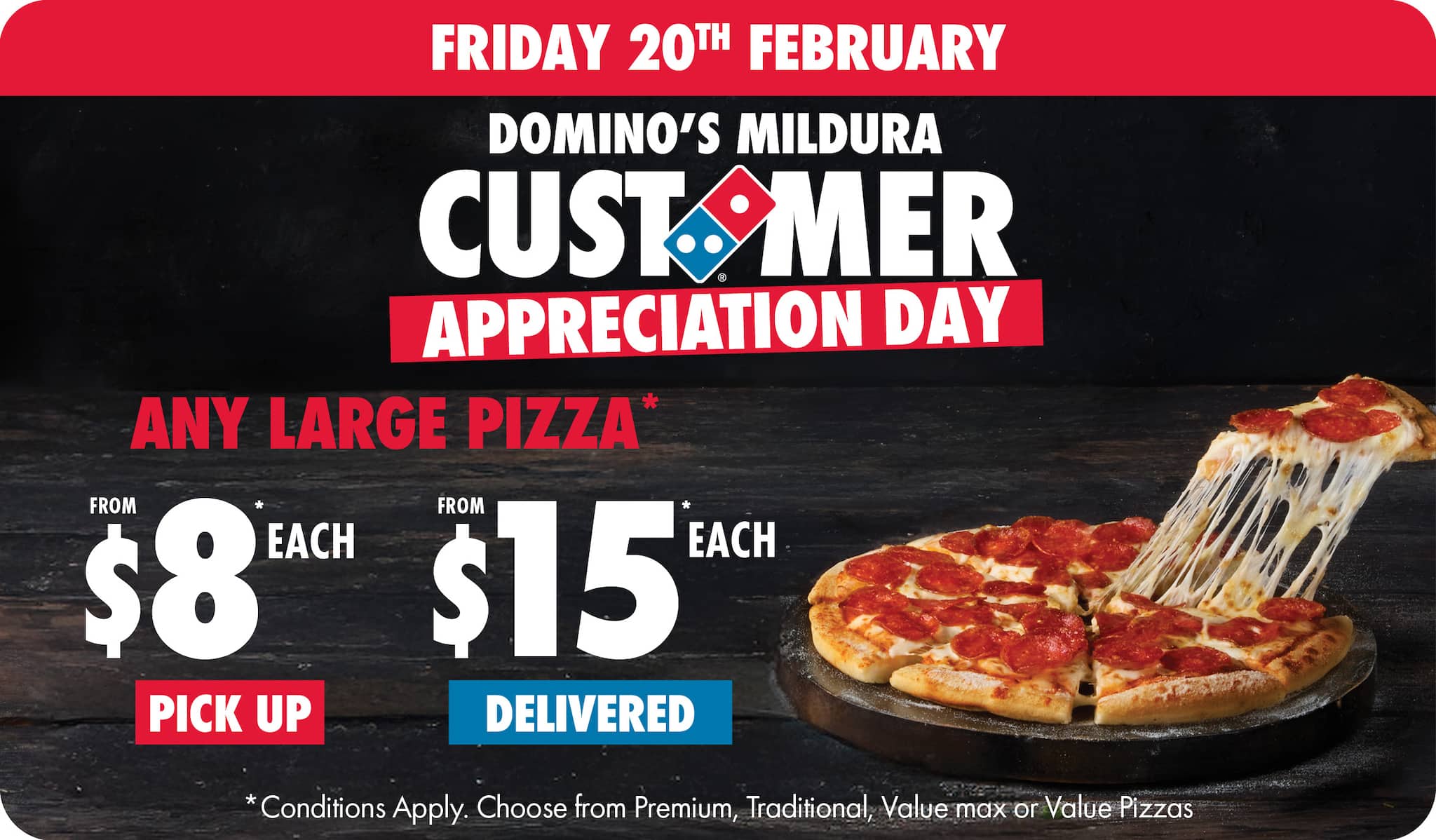 *10% surcharge applies on Sundays and after 10pm in selected stores. Surcharge of up to 20% applies on Public Holidays. Minimum delivery order $22.90 (excluding extended delivery, after 10pm, Sunday, and Public Holiday surcharges). Additional charges apply for extra toppings, half 'n' half & indulgent crusts. Limited area for delivery. For full terms and conditions click here.