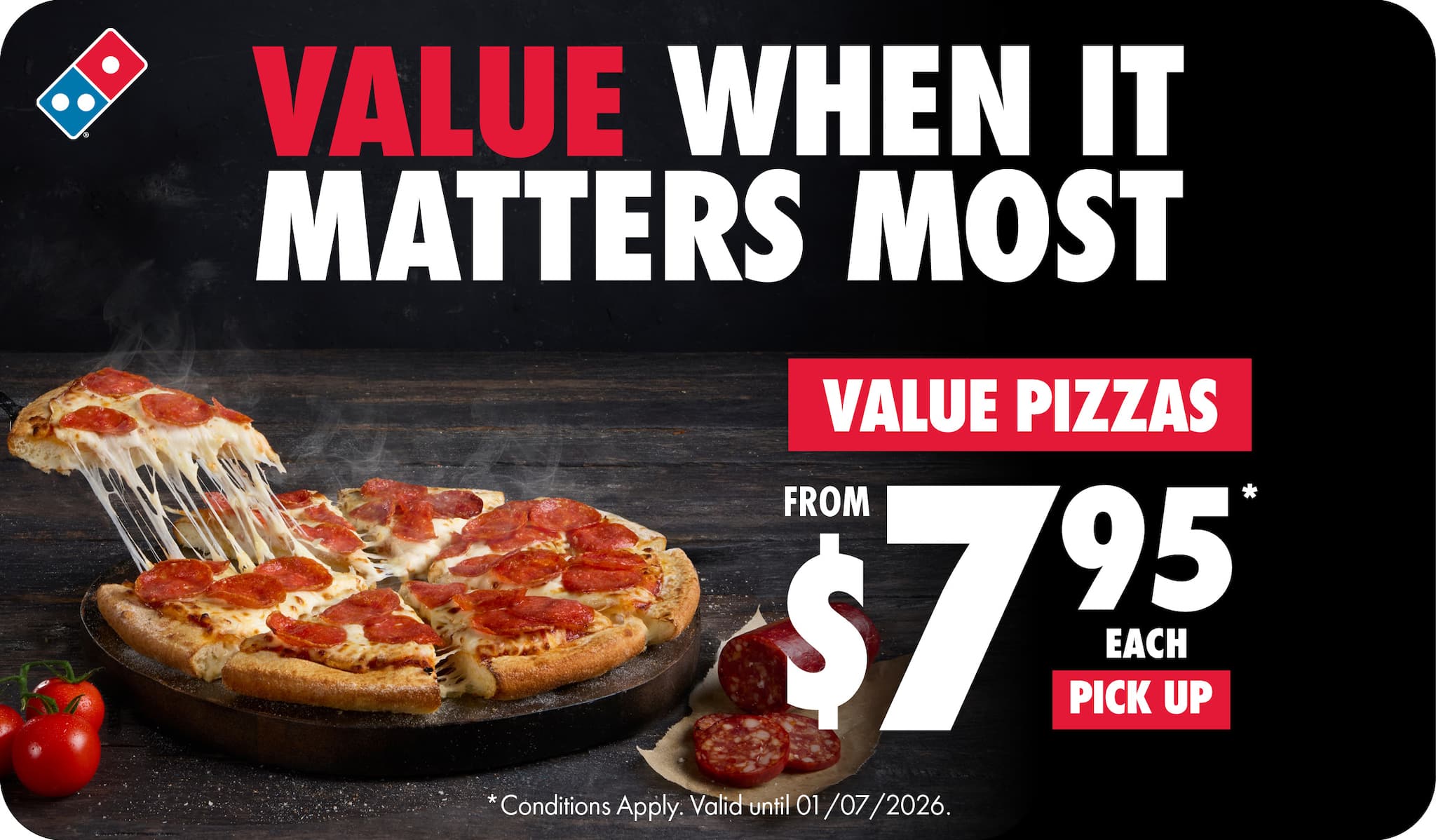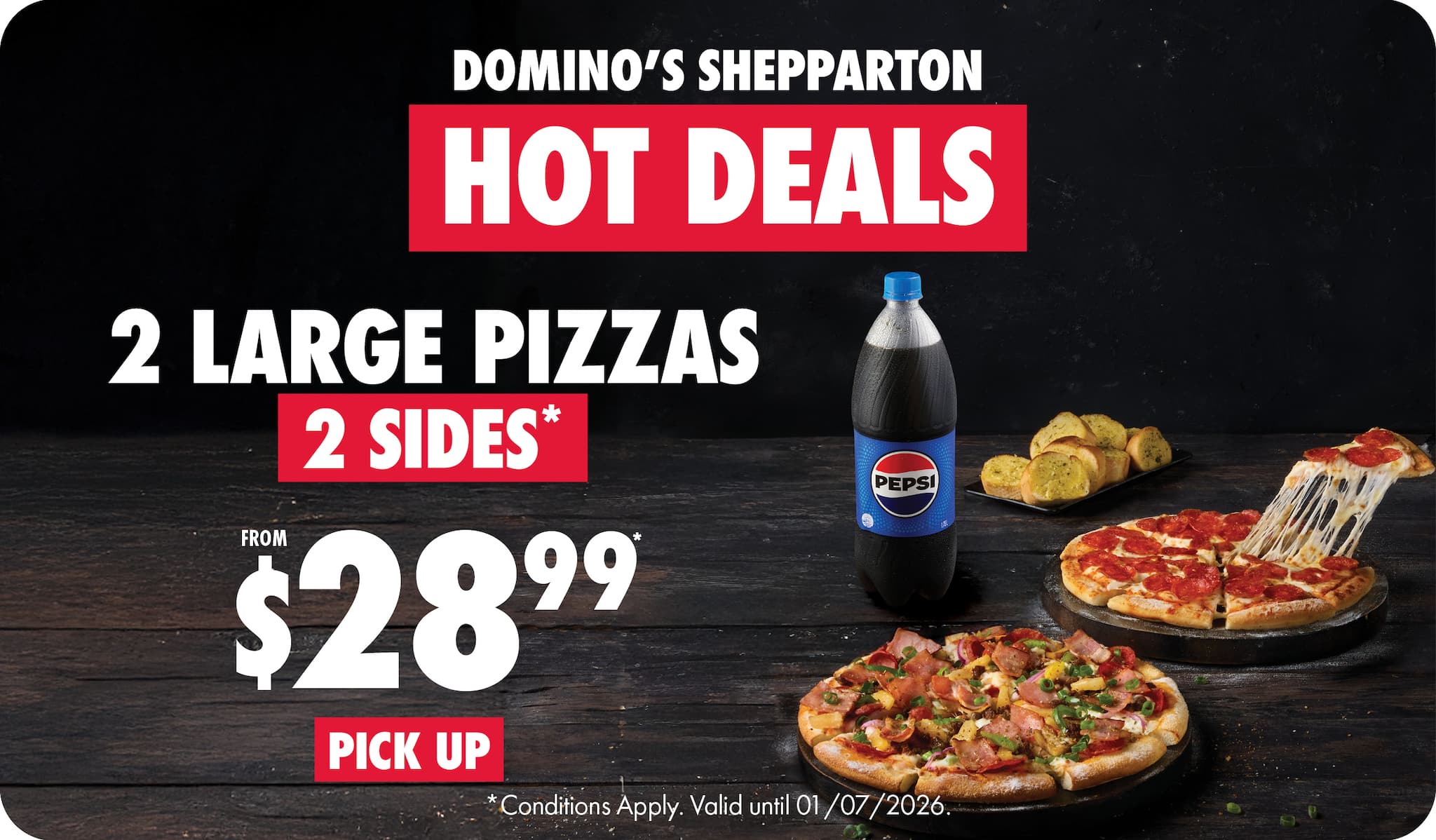 ORDER pick up NOW*Conditions apply. Valid until 01/07/2026. The price displayed is based on Large Value Range Pizzas & Garlic Bread & 1.25L drink side varieties. These can be upgraded for an additional cost.