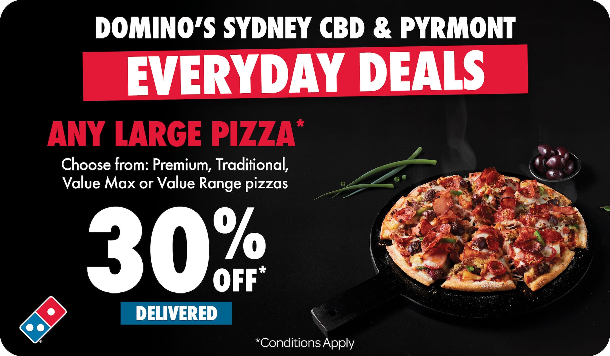 *10% surcharge applies on Sundays and after 10pm in selected stores. Surcharge of up to 20% applies on Public Holidays. Minimum delivery order $22.90 (excluding extended delivery, after 10pm, Sunday, and Public Holiday surcharges). Additional charges apply for extra toppings, half 'n' half & indulgent crusts. Limited area for delivery. For full terms and conditions click here.
