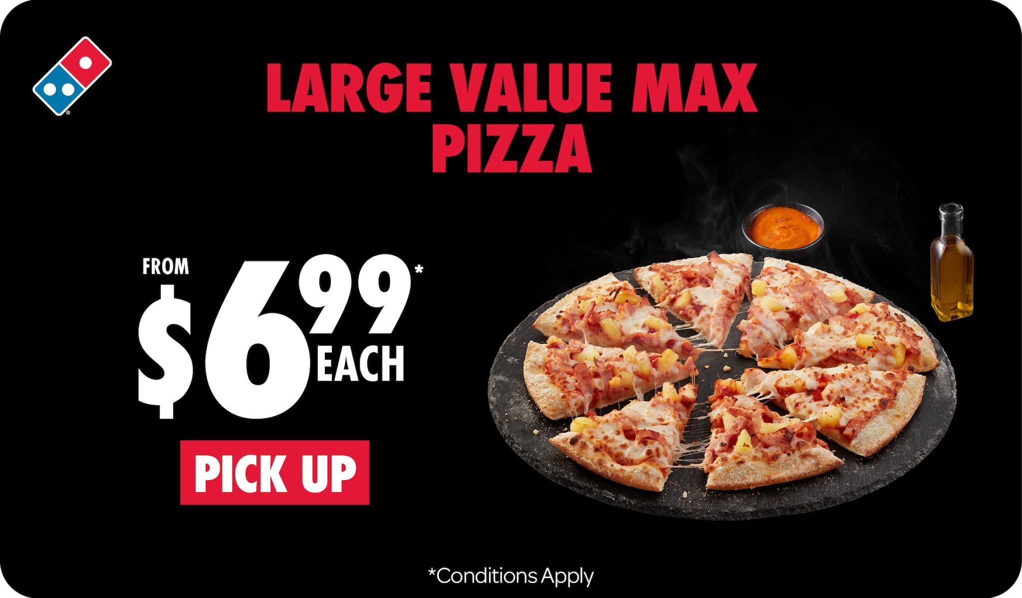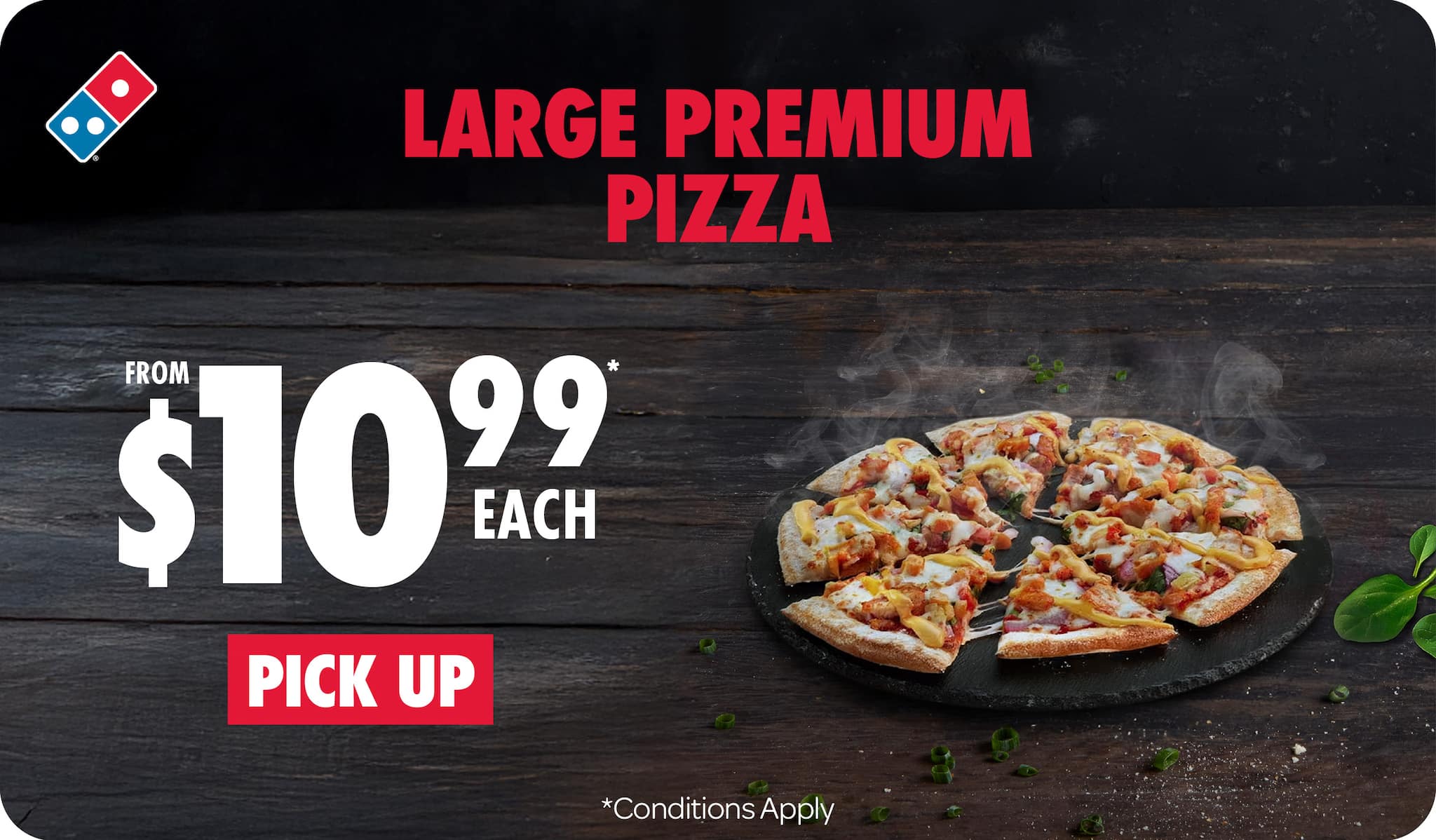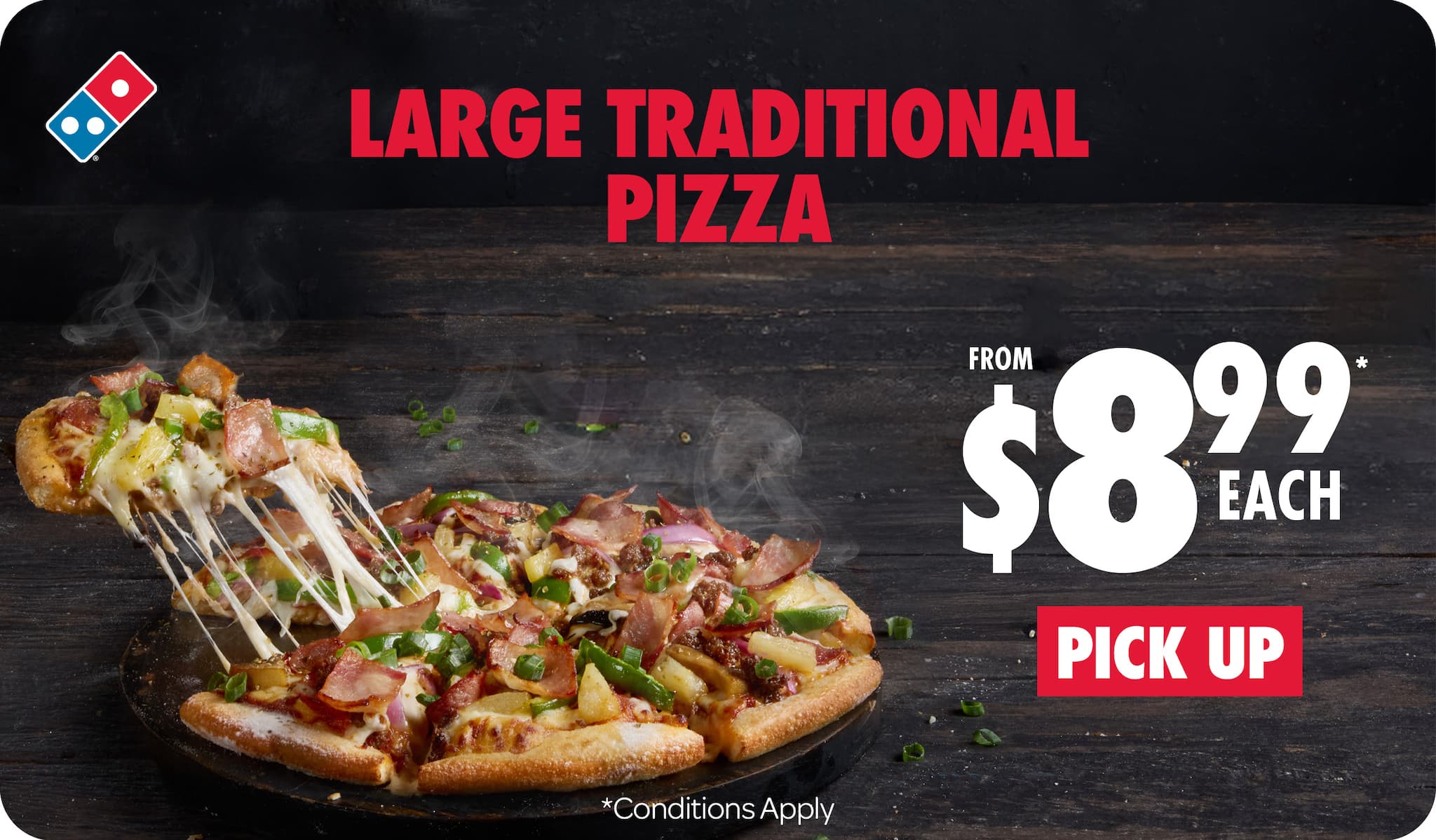 *10% surcharge applies on Sundays and after 10pm in selected stores. Surcharge of up to 20% applies on Public Holidays. Minimum delivery order $22.90 (excluding extended delivery, after 10pm, Sunday, and Public Holiday surcharges). Additional charges apply for extra toppings, half 'n' half & indulgent crusts. Limited area for delivery. For full terms and conditions click here.