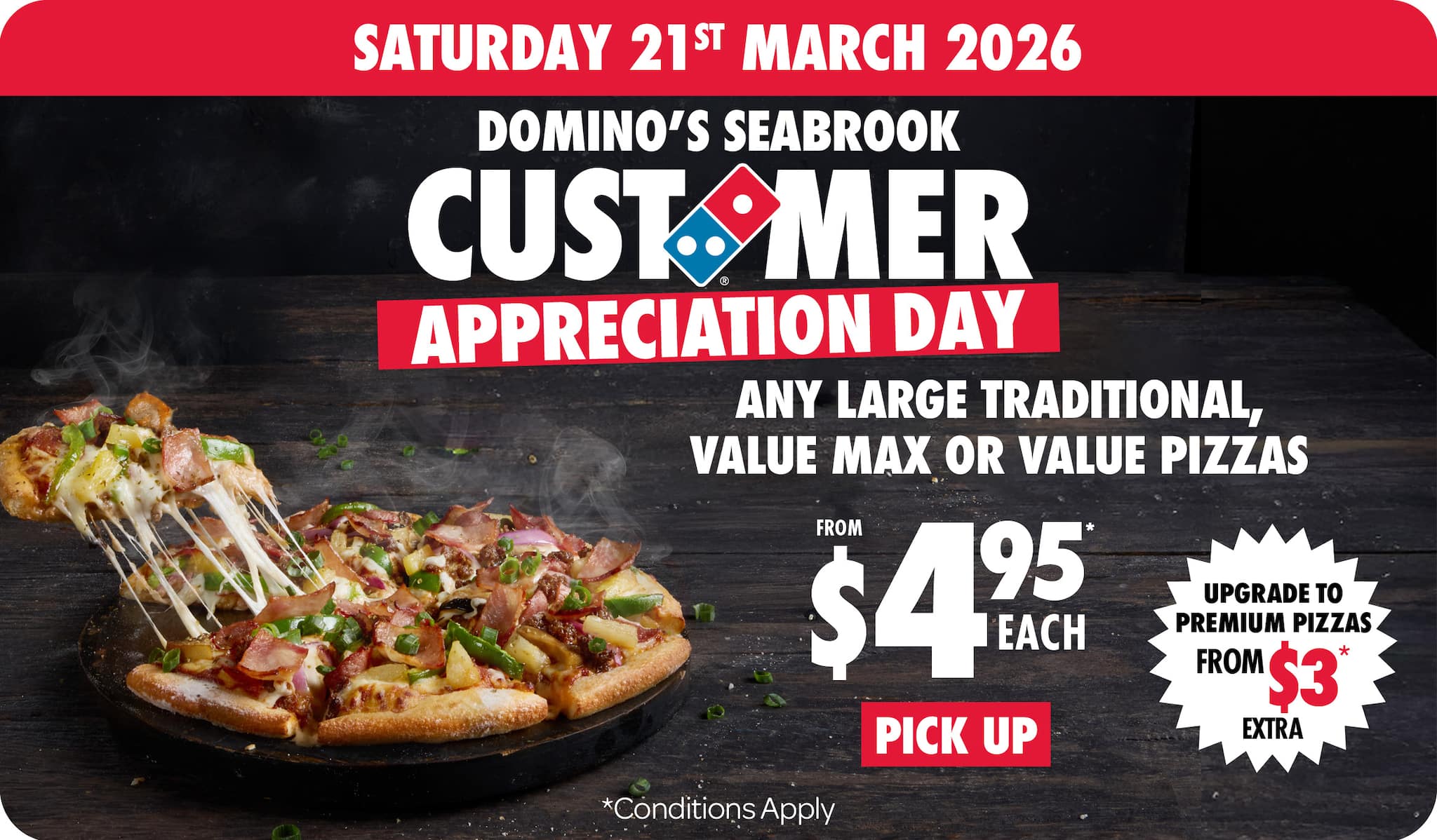 *10% surcharge applies on Sundays and after 10pm in selected stores. Surcharge of up to 20% applies on Public Holidays. Minimum delivery order $22.90 (excluding extended delivery, after 10pm, Sunday, and Public Holiday surcharges). Additional charges apply for extra toppings, half 'n' half & indulgent crusts. Limited area for delivery. For full terms and conditions click here.
