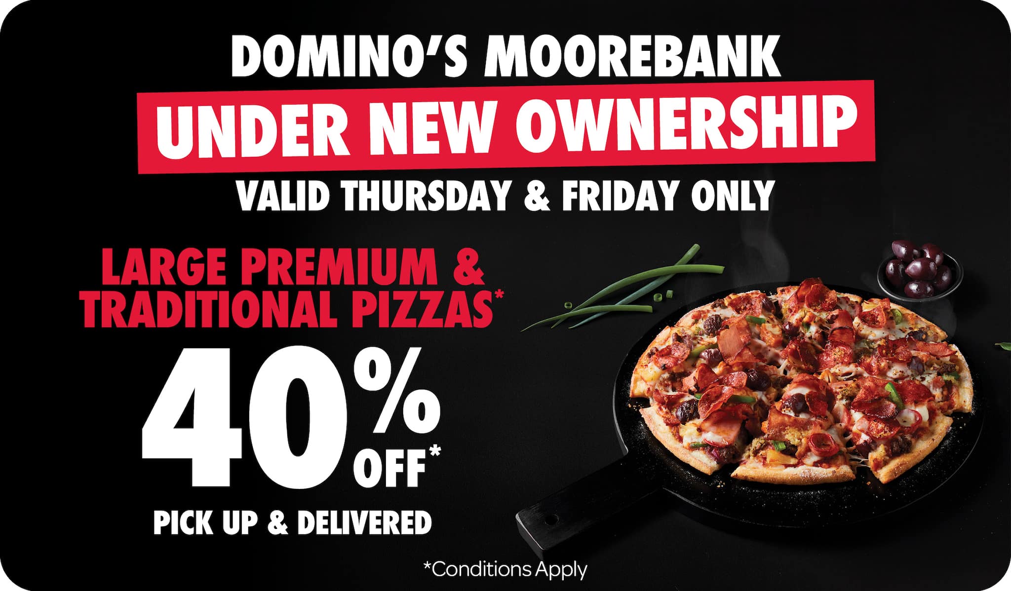 *The displayed prices are local prices at your selected store only. Customisation may incur additional charges. A $2 Half ’n’ Half surcharge applies to Large Pizzas; not available for Vegan Cheese, Gluten Free, or Lunch Box pizzas. Extra charges on Large Pizzas: $3 for Vegan Cheese, , $3.60 for Gluten Free Sourdough Crust, $3.50 for Cheesy Crust, $4 for Garlic Cheesy Crust; Premium Pizzas are $3 more than Traditional when using a Traditional Pizza voucher. Upgrade a Large to Family Size for $4 extra. Family available on Classic Crusts only. Family pizzas are 50% bigger in surface size post-bake, and have 50% more toppings, than Large Pizzas. Cheesy Crust, Garlic Cheesy Crust and Gluten Free Sourdough Crust available on Large Pizzas only. No indulgent crusts allowed on Vegan Cheese Pizzas. Substitute toppings may not be allowed on Promotional Pizzas. Mini Pizzas in Lunch Box are not customisable, vegan pizzas are not available.