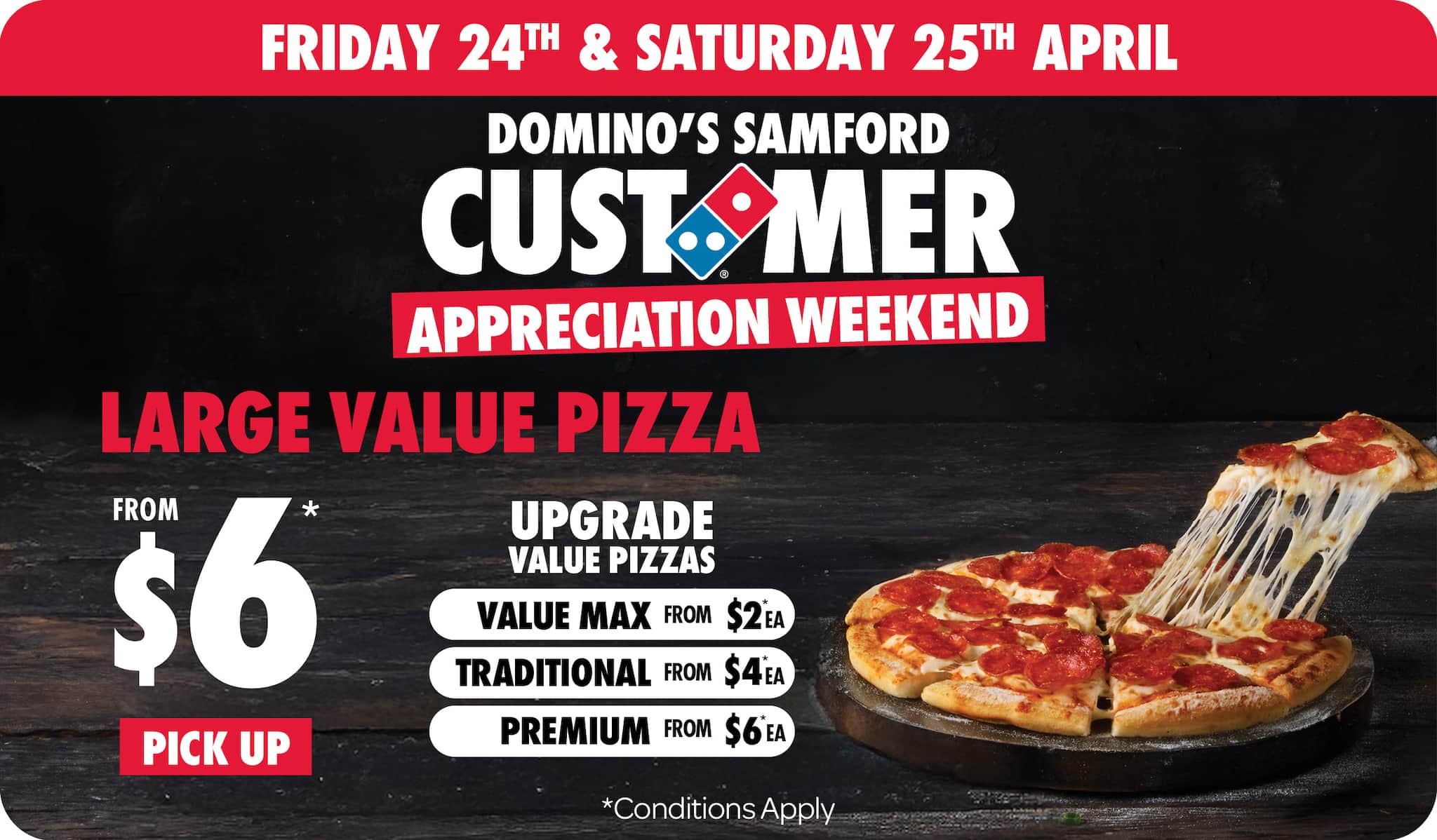 *10% surcharge applies on Sundays and after 10pm in selected stores. Surcharge of up to 20% applies on Public Holidays. Minimum delivery order $22.90 (excluding extended delivery, after 10pm, Sunday, and Public Holiday surcharges). Additional charges apply for extra toppings, half 'n' half & indulgent crusts. Limited area for delivery. For full terms and conditions click here.