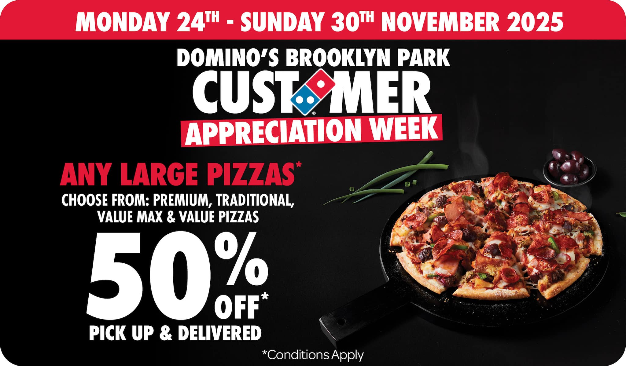 *10% surcharge applies on Sundays and after 10pm in selected stores. Surcharge of up to 20% applies on Public Holidays. Minimum delivery order $22.90 (excluding extended delivery, after 10pm, Sunday, and Public Holiday surcharges). Additional charges apply for extra toppings, half 'n' half & indulgent crusts. Limited area for delivery. For full terms and conditions click here.