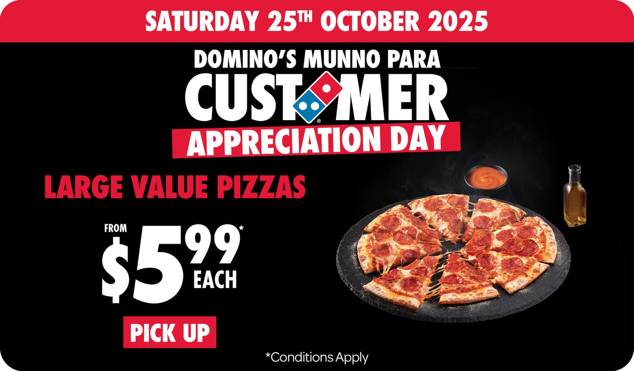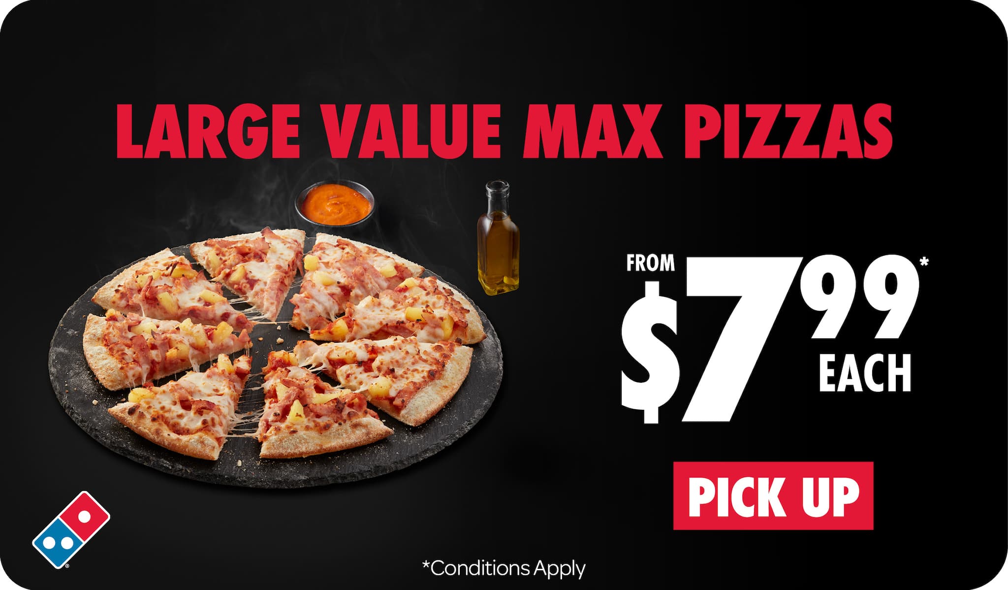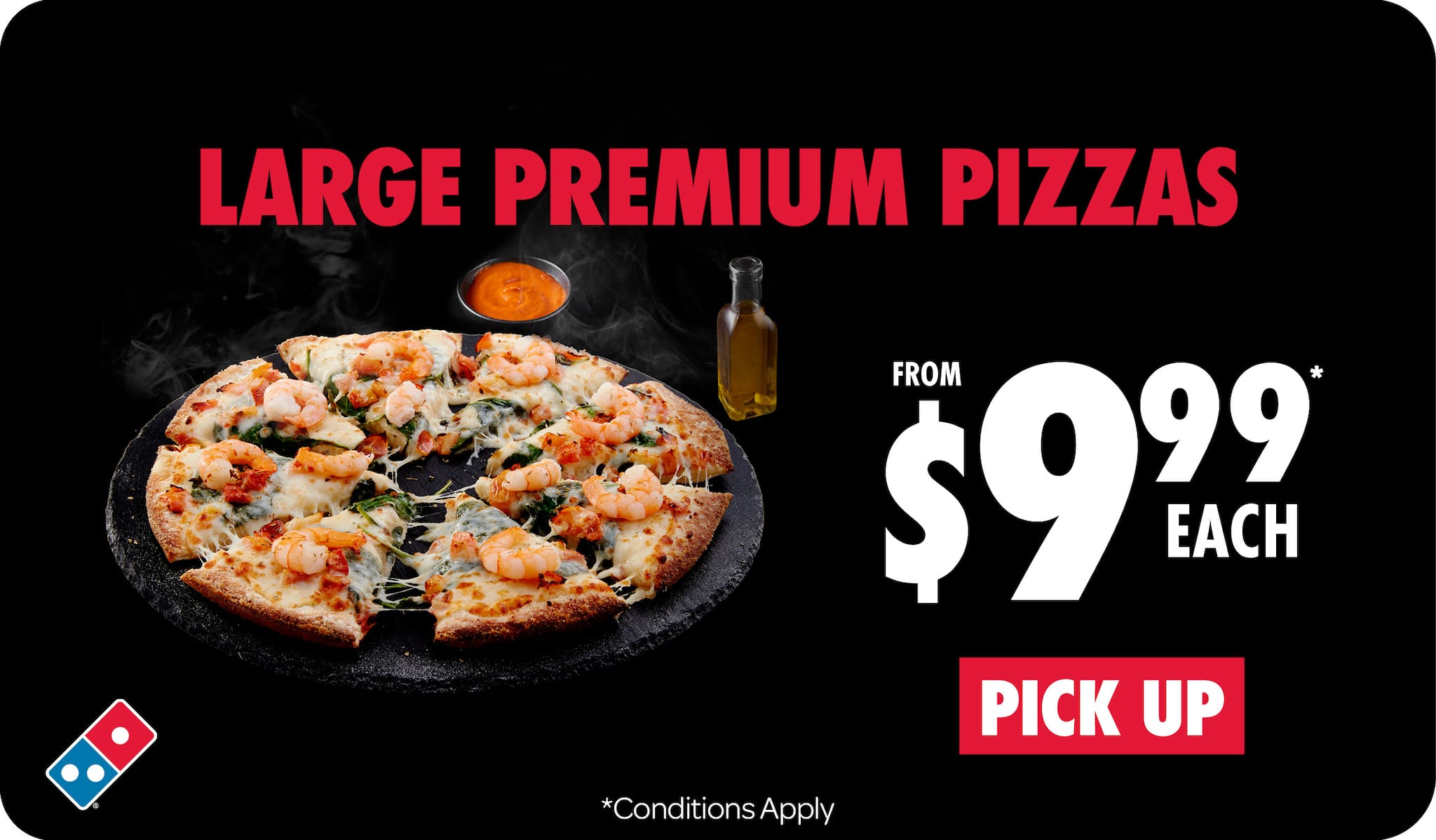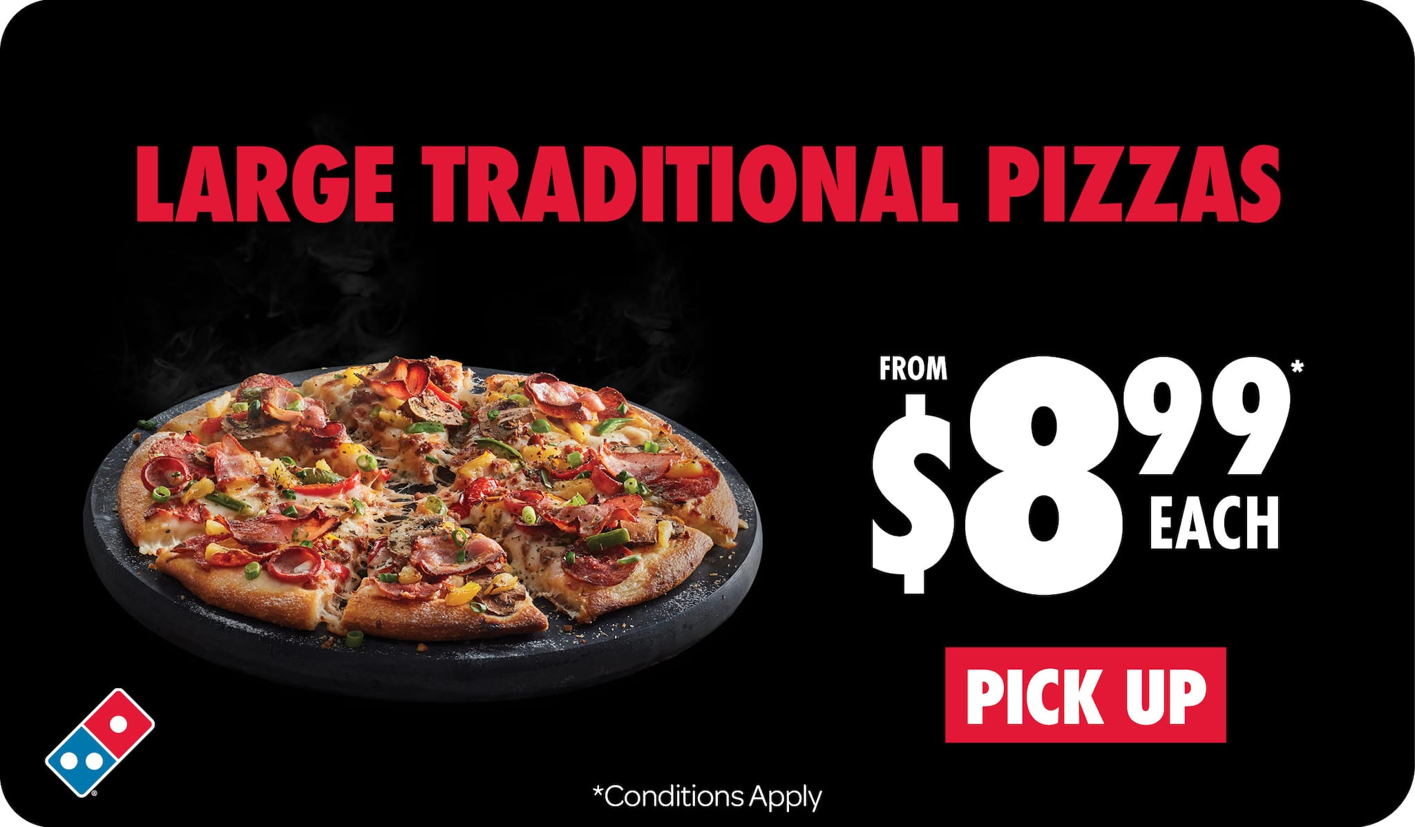 *The displayed prices are local prices at your selected store only. Customisation may incur additional charges. A $2 Half ’n’ Half surcharge applies to Large Pizzas; not available for Vegan Cheese, Gluten Free, or Lunch Box pizzas. Extra charges on Large Pizzas: $3 for Vegan Cheese, , $3.60 for Gluten Free Sourdough Crust, $3.50 for Cheesy Crust, $4 for Garlic Cheesy Crust; Premium Pizzas are $3 more than Traditional when using a Traditional Pizza voucher. Upgrade a Large to Family Size for $4 extra. Family available on Classic Crusts only. Family pizzas are 50% bigger in surface size post-bake, and have 50% more toppings, than Large Pizzas. Cheesy Crust, Garlic Cheesy Crust and Gluten Free Sourdough Crust available on Large Pizzas only. No indulgent crusts allowed on Vegan Cheese Pizzas. Substitute toppings may not be allowed on Promotional Pizzas. Mini Pizzas in Lunch Box are not customisable, vegan pizzas are not available.