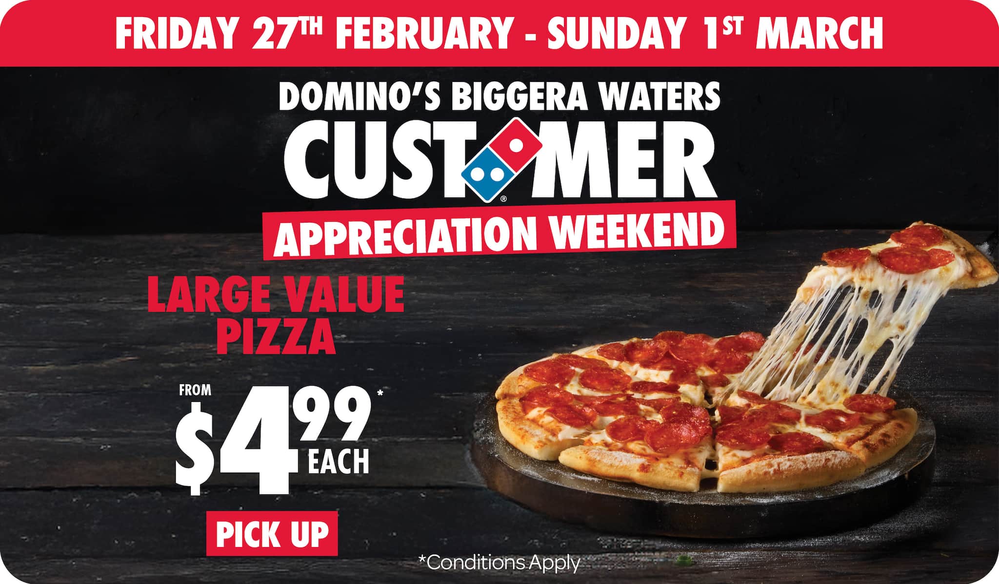*10% surcharge applies on Sundays and after 10pm in selected stores. Surcharge of up to 20% applies on Public Holidays. Minimum delivery order $22.90 (excluding extended delivery, after 10pm, Sunday, and Public Holiday surcharges). Additional charges apply for extra toppings, half 'n' half & indulgent crusts. Limited area for delivery. For full terms and conditions click here.