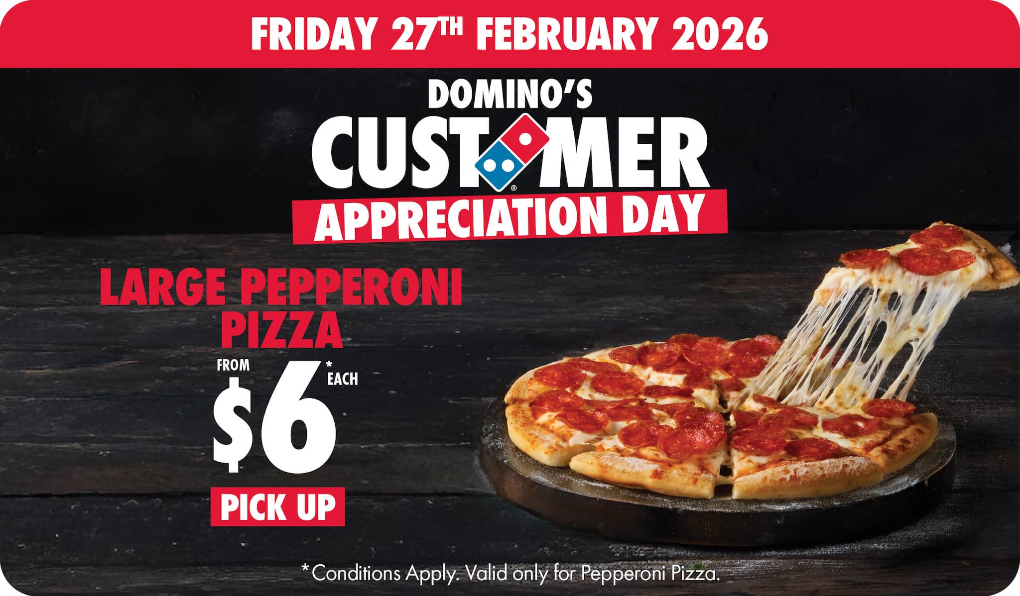 *10% surcharge applies on Sundays and after 10pm in selected stores. Surcharge of up to 20% applies on Public Holidays. Minimum delivery order $22.90 (excluding extended delivery, after 10pm, Sunday, and Public Holiday surcharges). Additional charges apply for extra toppings, half 'n' half & indulgent crusts. Limited area for delivery. For full terms and conditions click here.