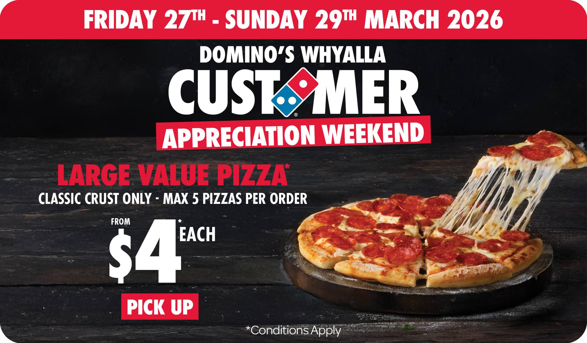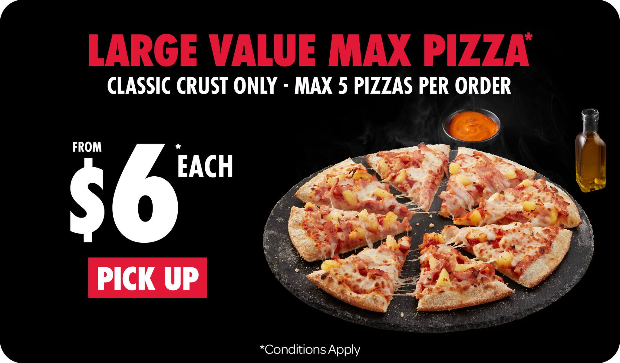 *10% surcharge applies on Sundays and after 10pm in selected stores. Surcharge of up to 20% applies on Public Holidays. Minimum delivery order $22.90 (excluding extended delivery, after 10pm, Sunday, and Public Holiday surcharges). Additional charges apply for extra toppings, half 'n' half & indulgent crusts. Limited area for delivery. For full terms and conditions click here.