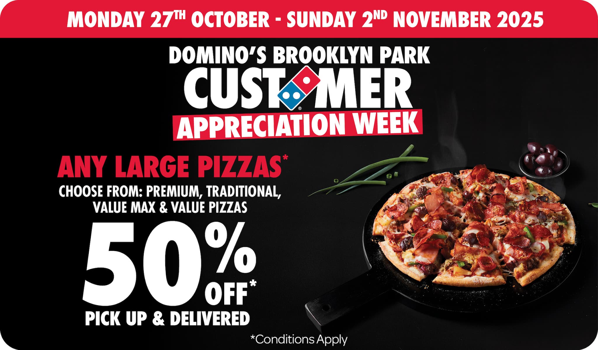*10% surcharge applies on Sundays and after 10pm in selected stores. Surcharge of up to 20% applies on Public Holidays. Minimum delivery order $22.90 (excluding extended delivery, after 10pm, Sunday, and Public Holiday surcharges). Additional charges apply for extra toppings, half 'n' half & indulgent crusts. Limited area for delivery. For full terms and conditions click here.