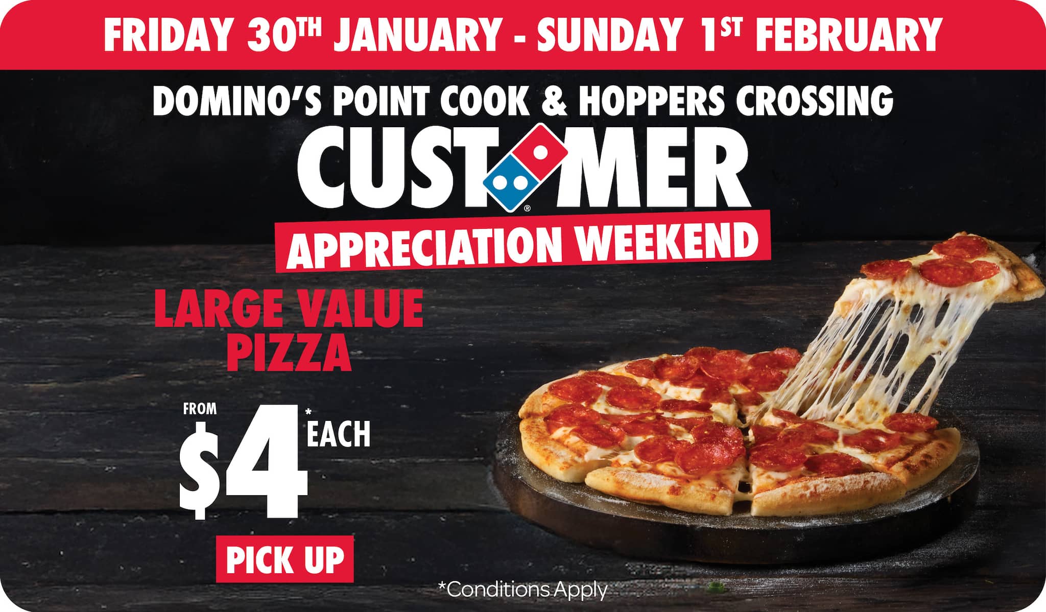 *10% surcharge applies on Sundays and after 10pm in selected stores. Surcharge of up to 20% applies on Public Holidays. Minimum delivery order $22.90 (excluding extended delivery, after 10pm, Sunday, and Public Holiday surcharges). Additional charges apply for extra toppings, half 'n' half & indulgent crusts. Limited area for delivery. For full terms and conditions click here.