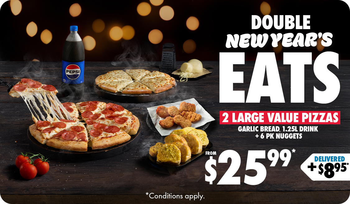 *Conditions apply. Deal includes Large Traditional Range pizzas and Garlic Bread or 1.25L drink varieties as sides. Customisation and upgrades may incur additional charges. 10% surcharge on Sundays, and after 10pm. Up to 20% surcharge on public holidays. Delivery $8.95 per order plus applicable surcharges. Minimum delivery order value may vary by store, up to $22.90. Selected Western Australia Stores for a limited time only.