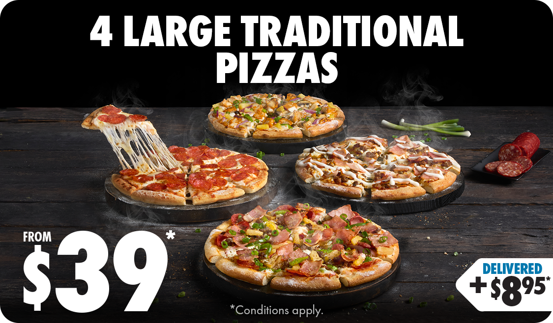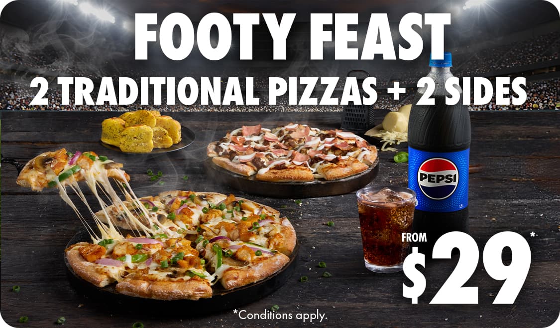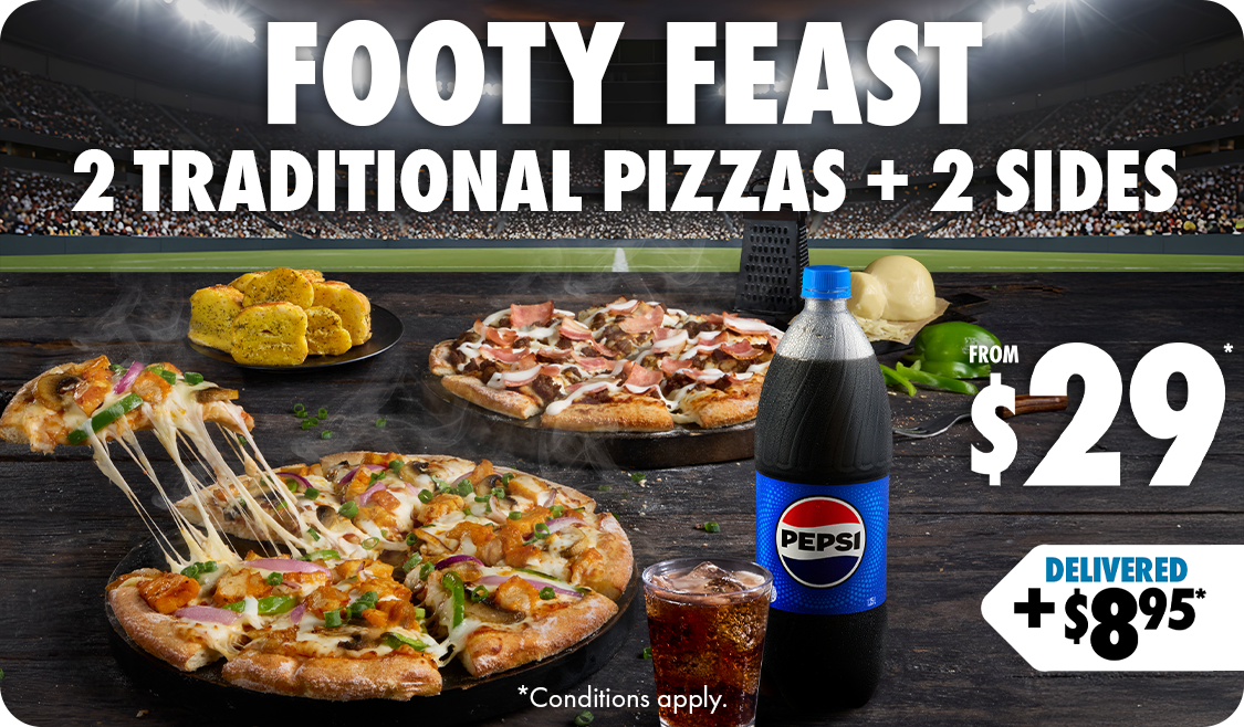 *Conditions apply. Deal includes Large Traditional Range pizzas and Garlic Bread or 1.25L drink varieties as sides. Customisation and upgrades may incur additional charges. 10% surcharge on Sundays, and after 10pm. Up to 20% surcharge on public holidays. Delivery $8.95 per order plus applicable surcharges. Minimum delivery order value may vary by store, up to $22.90. Selected Western Australia Stores for a limited time only.