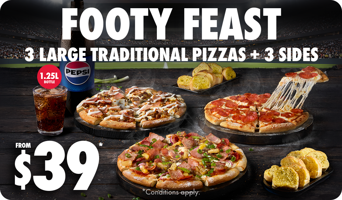 *Conditions apply. Deal includes Large Traditional Range pizzas and Garlic Bread or 1.25L drink varieties as sides. Customisation and upgrades may incur additional charges. 10% surcharge on Sundays, and after 10pm. Up to 20% surcharge on public holidays. Delivery $8.95 per order plus applicable surcharges. Minimum delivery order value may vary by store, up to $22.90. Selected Western Australia Stores for a limited time only.