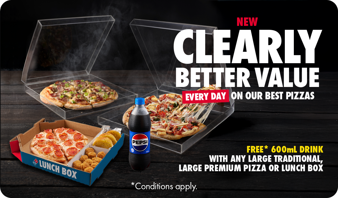 *The displayed prices are local prices at your selected store only. Customisation may incur additional charges. A $2 Half ’n’ Half surcharge applies to Large Pizzas; not available for Vegan Cheese, Gluten Free, or Lunch Box pizzas. Extra charges on Large Pizzas: $3 for Vegan Cheese, , $3.60 for Gluten Free Sourdough Crust, $3.50 for Cheesy Crust, $4 for Garlic Cheesy Crust; Premium Pizzas are $3 more than Traditional when using a Traditional Pizza voucher. Upgrade a Large to Family Size for $4 extra. Family available on Classic Crusts only. Family pizzas are 50% bigger in surface size post-bake, and have 50% more toppings, than Large Pizzas. Cheesy Crust, Garlic Cheesy Crust and Gluten Free Sourdough Crust available on Large Pizzas only. No indulgent crusts allowed on Vegan Cheese Pizzas. Substitute toppings may not be allowed on Promotional Pizzas. Mini Pizzas in Lunch Box are not customisable, vegan pizzas are not available.