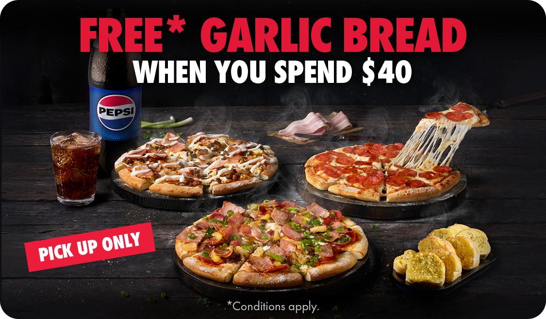 *Conditions apply. Receive a free Garlic Bread with any purchase of $40 or more. Available for pick up only. 1 per customer, per order. Not available with any other offers. 10% surcharge on Sundays, and after 10pm. Up to 20% surcharge on public holidays. Selected Western Australia Stores for a limited time only.