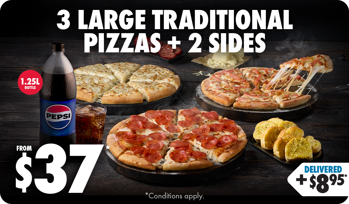*Conditions apply. Deal includes Large Traditional Range pizzas and Garlic Bread or 1.25L drink varieties as sides. Customisation and upgrades may incur additional charges. 10% surcharge on Sundays, and after 10pm. Up to 20% surcharge on public holidays. Delivery $8.95 per order plus applicable surcharges. Minimum delivery order value may vary by store, up to $22.90. Selected Western Australia Stores for a limited time only.