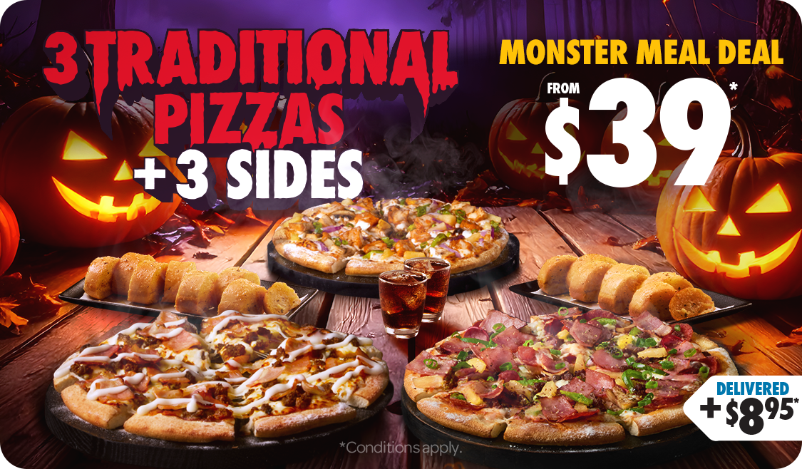 *Conditions apply. Deal includes Large Traditional Range pizzas and Garlic Bread or 1.25L drink varieties as sides. Customisation and upgrades may incur additional charges. 10% surcharge on Sundays, and after 10pm. Up to 20% surcharge on public holidays. Delivery $8.95 per order plus applicable surcharges. Minimum delivery order value may vary by store, up to $22.90. Selected Western Australia Stores for a limited time only.