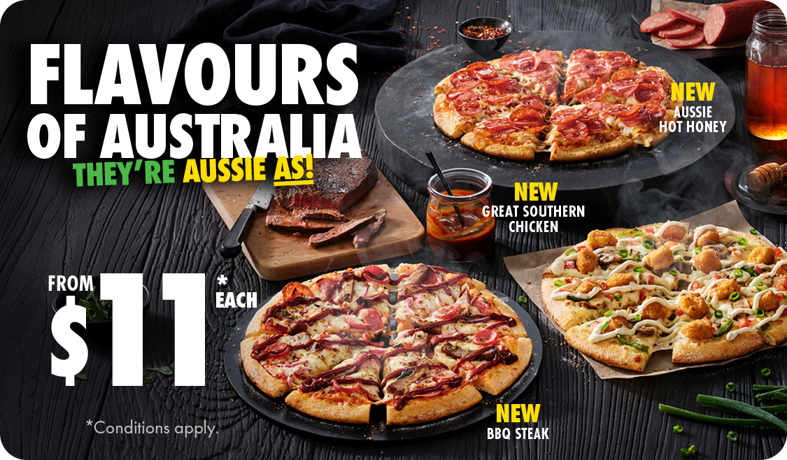 *Conditions apply. Aussie Hot Honey Large Pizza from $11. Customisation and upgrades may incur additional charges. 10% surcharge on Sundays, and after 10pm. Up to 20% surcharge on public holidays. Delivery $8.95 per order plus applicable surcharges. Minimum delivery order value may vary by store, up to $22.90. Selected Western Australia Stores for a limited time only.