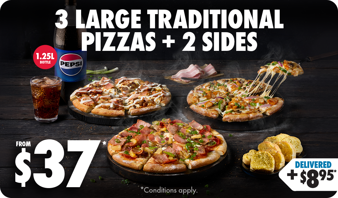 *Conditions apply. Deal includes Large Traditional Range pizzas and Garlic Bread or 1.25L drink varieties as sides. Customisation and upgrades may incur additional charges. 10% surcharge on Sundays, and after 10pm. Up to 20% surcharge on public holidays. Delivery $8.95 per order plus applicable surcharges. Minimum delivery order value may vary by store, up to $22.90. Selected Western Australia Stores for a limited time only.