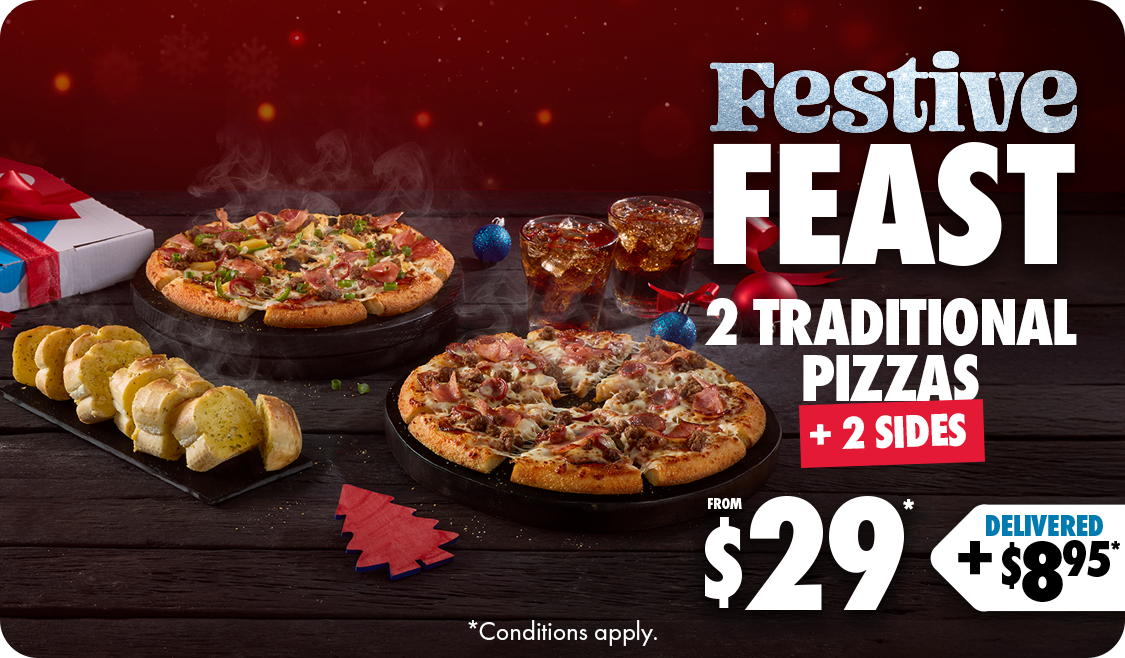 *Conditions apply. Deal includes Large Traditional Range pizzas and Garlic Bread or 1.25L drink varieties as sides. Customisation and upgrades may incur additional charges. 10% surcharge on Sundays, and after 10pm. Up to 20% surcharge on public holidays. Delivery $8.95 per order plus applicable surcharges. Minimum delivery order value may vary by store, up to $22.90. Selected Western Australia Stores for a limited time only.
