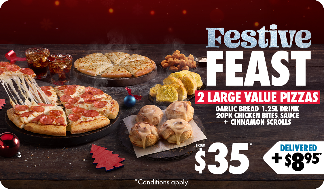 Festive Feast: 2 Pizzas, Garlic Bread, a Drink, Chicken & Cinnamon Scrolls from $35*