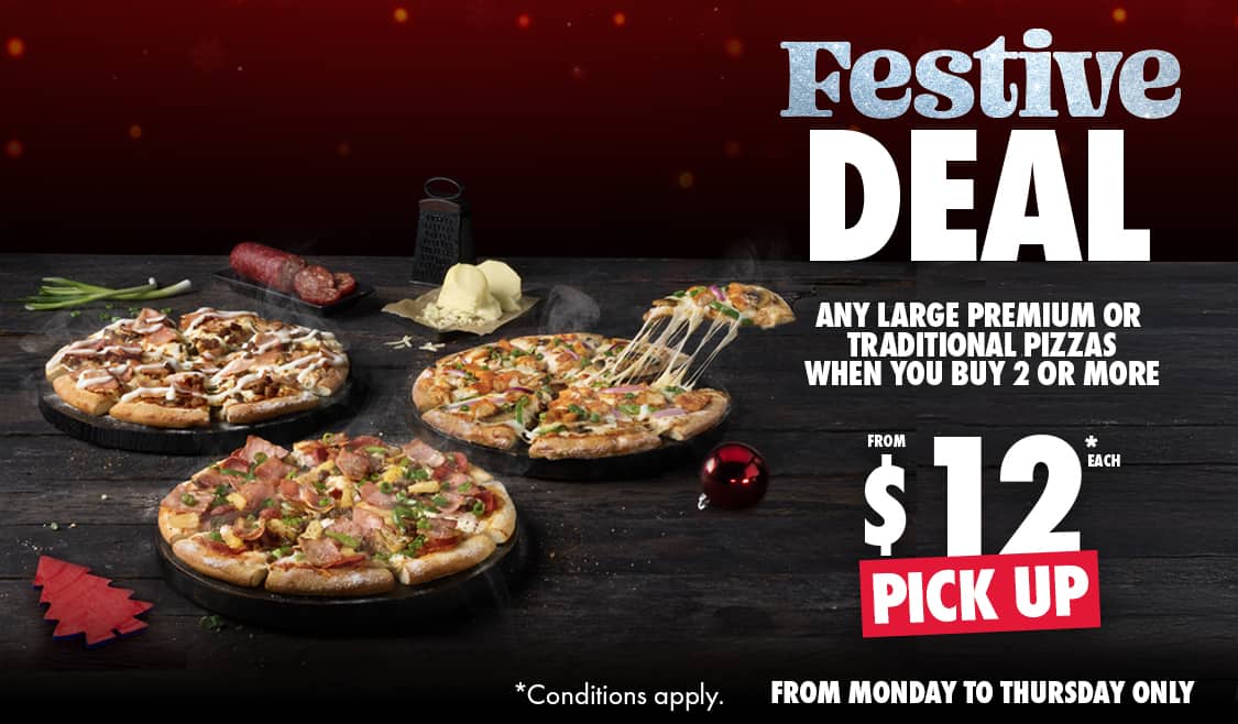 *Conditions apply. Deal includes Large Traditional Range pizzas and Garlic Bread or 1.25L drink varieties as sides. Customisation and upgrades may incur additional charges. 10% surcharge on Sundays, and after 10pm. Up to 20% surcharge on public holidays. Delivery $8.95 per order plus applicable surcharges. Minimum delivery order value may vary by store, up to $22.90. Selected Western Australia Stores for a limited time only.