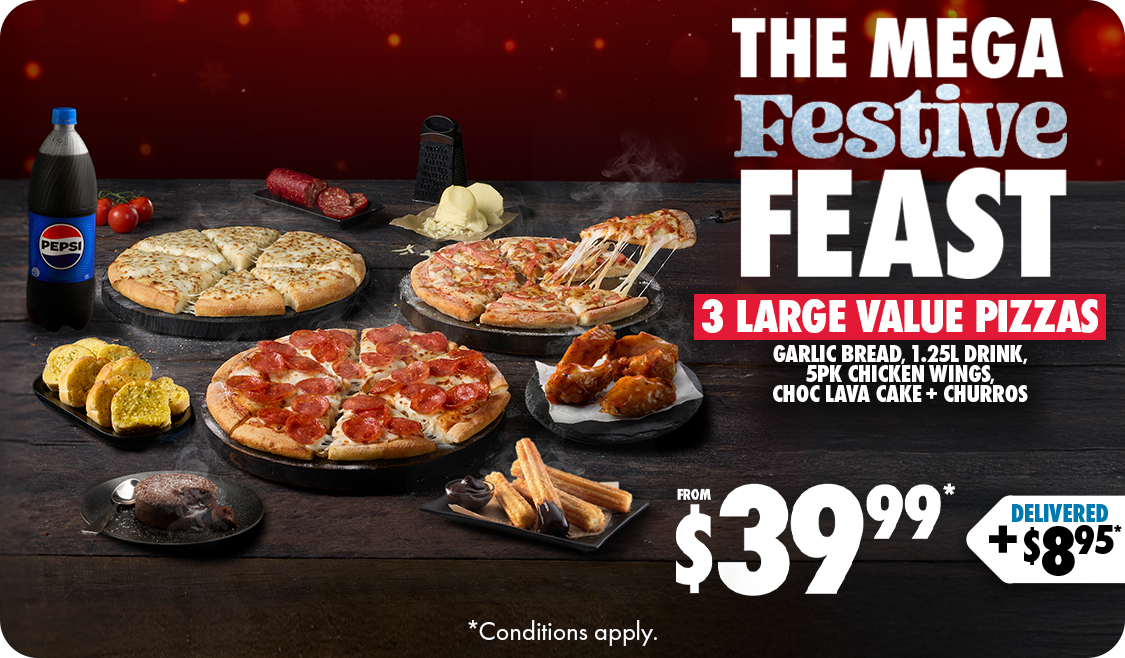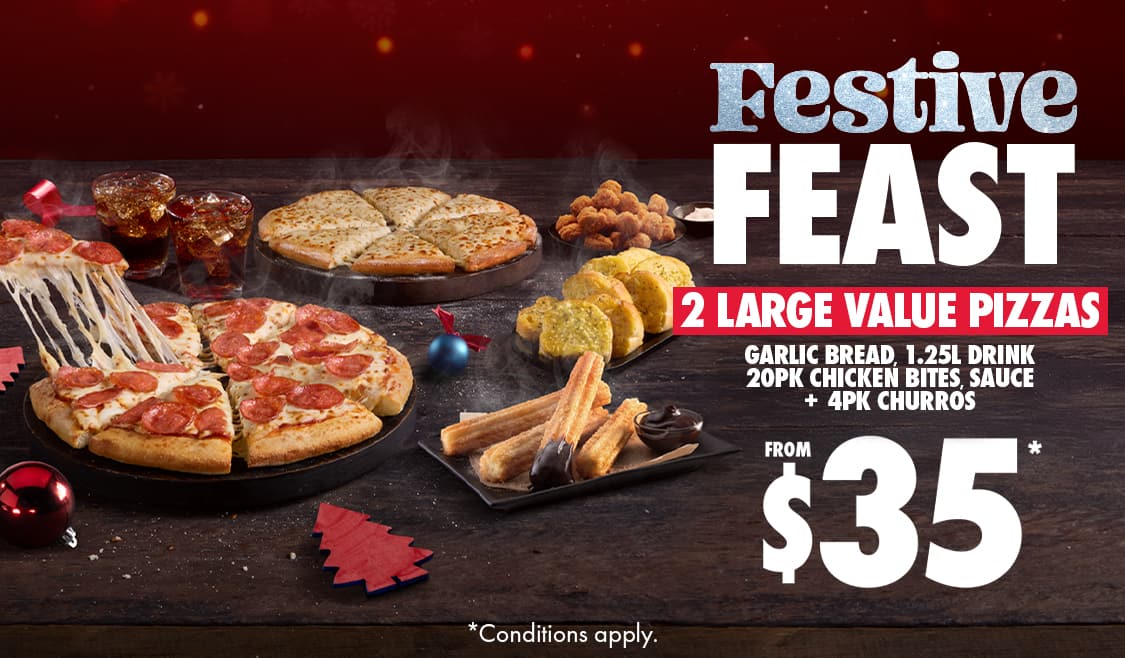 *Conditions apply. Deal includes Large Traditional Range pizzas and Garlic Bread or 1.25L drink varieties as sides. Customisation and upgrades may incur additional charges. 10% surcharge on Sundays, and after 10pm. Up to 20% surcharge on public holidays. Delivery $8.95 per order plus applicable surcharges. Minimum delivery order value may vary by store, up to $22.90. Selected Western Australia Stores for a limited time only.